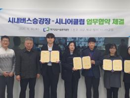 대구공공시설관리공단(이사장 문기봉) 시내버스유개승강장은 지난 3월 10일(화), 시내버스유개승강장 사무실에서 지역 4개 시니어클럽과 업무협약을 체결했다.공단과 시니어클럽(중구, 달서구, 서구, 북구)
