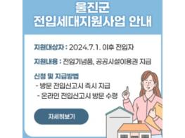 울진군은 2024년 7월 1일부터 시행 중인‘울진군 전입세대지원 사업’을 2026년에도 지속 추진한다. 이 사업은 울진군으로 전입한 세대에게 전입을 축하하는 기념품과 공공시설이용권을 지급함으로써 우리