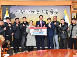 울주군 지역 봉사단체인 ‘비나리봉사단’이 8일 울주군에 지역 저소득세대를 위한 성금 500만원을 전달했다. 울주군은 이날 군청 소회의실에서 이순걸 군수, 비나리봉사단 최병환 회장, 울산사회복지공동모