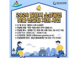 경남 밀양시는 관내 소상공인의 자생력을 높이고 경영 안정을 도모하기 위해 ‘2026년 소상공인 맞춤 컨설팅 지원사업’을 추진한다고 11일 밝혔다.이번 사업은 경영 애로를 겪고 있는 소상공인을 대상으로