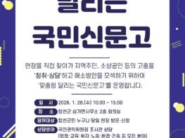 합천군은 2026년 1월 28일 오전 10시부터 오후 3시까지 삼가면사무소에서 국민권익위원회와 함께하는 ‘맞춤형 달리는 국민신문고’를 운영할 예정이다.‘맞춤형 달리는 국민신문고’는 고충이나 불편이 있