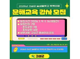 고성군은 2026년 학력인정 문해교육 프로그램의 원활한 운영을 위하여 강사 7명을 공개 모집한다고 밝혔다.모집 분야는 초등학력인정 문해교육 강사 1명과 중학학력인정 문해교육 과목별 강사 6명 등 총 7명