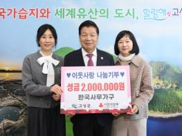 고성군 대독리 소재 한국사무가구 김현주 부사장은 1월 6일, 고성군청을 방문하여 관내 어려운 이웃을 위해 써 달라며 이웃돕기성금 200만 원을 전달했다.한국사무가구는 사무용 가구 전문 업체로, 지역을
