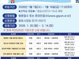 고성군청소년센터“온”은 겨울방학을 맞이한 관내 청소년들을 대상으로 2026년 1월 20일부터 2월 14일까지 2026년 겨울방학 프로그램 및 특강을 운영한다.이번 겨울방학 프로그램은 청소년들의 흥미와 자기