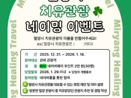 밀양시는 치유관광의 이미지를 확산하고, 관광객의 시각에서 밀양의 매력을 재조명하기 위해 ‘밀양시 치유관광 작명 이벤트’를 오는 18일까지 진행한다.이번 이벤트는 밀양의 치유관광을 대표할 수 있는