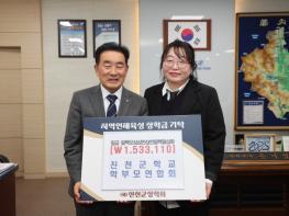 진천군학교학부모연합회(회장 홍세연)는 26일 일일찻집, 바자회를 통해 마련한 수익금 150여 만원을 (재)진천군장학회에 기탁했다. 진천군 관내 30여 개 초·중·고등학교 학부모회 회장단으로 구성된 진천군