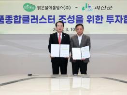충북 괴산군은 10일 서울 여의도 중기중앙회에서 송인헌 군수, 김석원 맑은물에홀딩스(주) 대표이사 등이 참석해 지역 경제 활성화 및 일자리 창출을 위한 식품종합클러스터 조성 투자협약을 체결했다고 밝