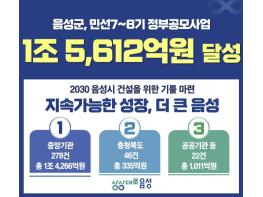 음성군이 민선 7기부터 민선 8기에 이르기까지 중앙부처, 충청북도, 공공기관 등이 주관하는 공모사업에서 총 346건이 선정돼 총사업비 1조 5612억원의 예산을 확보하는 쾌거를 달성했다.군은 전체 공모사업