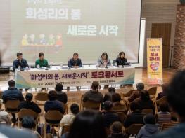 충북 증평군이 25일 도안창고플러스에서 ‘화성리의 봄, 새로운 시작’ 토크콘서트를 열고, 화성리지구의 ‘농촌공간정비사업’선정 과정과 향후 재생 방향을 주민들과 공유했다.‘29년의 흉물, 이제는 희망