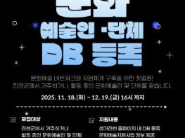 충북 진천군 생거진천 문화재단은 진천군 문화예술인·단체 데이터베이스(DB) 구축을 위해 오는 12월 19일까지 등록 신청을 받는다고 21일 밝혔다.이번 사업은 군에서 활동하는 문화예술인과 단체 현황을 조