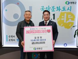 나노헬스케어㈜ 김정헌 대표가 5일 영동군청을 찾아 500만 원의 기부금을 전달하며 고향사랑기부제에 동참했다.영동읍 비탄리가 고향인 김정헌 대표는 매년 고향인 영동군을 방문해 △성금 △물품 △장학금