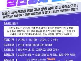 (재)천안시청소년재단 천안시태조산청소년수련관이 2월 7일까지 ‘2026년 청년강사 양성 사업’ 참여자를 모집한다. 올해로 5년째를 맞이한 이번 사업은 청년들에게 교육 현장에서 직접 강의할 기회를 제공