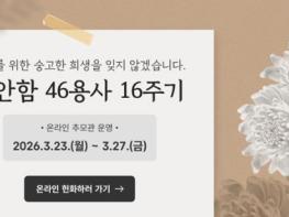 천안시가 제11회 서해수호의 날과 천안함 피격사건 16주기를 맞아 천안함 46용사의 숭고한 희생을 기리는 전 시민 추모 기간을 운영한다고 20일 밝혔다. 시는 오는 23일부터 5일간 시청 누리집에 ‘온라인