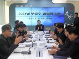 부안군은 20일 군청 3층 중회의실에서 정화영 부군수 주재로 2026년 부군수-읍·면장 회의를 개최하고 2025년 주요 성과와 2026년 군정 운영방향을 공유하며 읍·면 현안에 대한 사전 점검에 나섰다고 밝혔다.