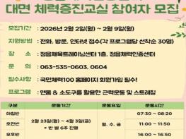 정읍체력인증센터가 시민들의 건강한 삶을 지원하고 체계적인 체력 관리를 돕기 위해 ‘2026년 대면 체력증진교실 1기’ 참여자를 오는 2월 2일부터 9일까지(주말 제외) 선착순으로 모집한다.이번 체력증진