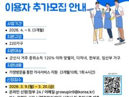 군산시가 가사 부담을 겪는 가정을 지원하기 위해 ‘군산형 가사서비스 지원사업’의 상반기 이용자를 추가 모집한다.시는 더 많은 가정이 혜택을 받을 수 있도록, 지난 모집에서 마감되지 않은 220가구에