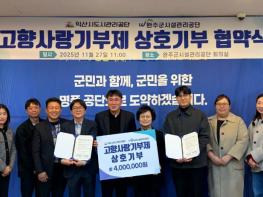 완주군시설관리공단이 최근 공단 회의실에서 익산시도시관리공단과 ‘고향사랑기부제 상호기부 업무협약’을 체결했다.이번 협약은 지역 간 상생 협력을 강화하기 위해 마련된 것으로, 임직원의 자발적 참여