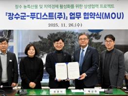 장수군은 26일 군청 회의실에서 B2B 식자재 전문 기업인 푸디스트 주식회사(사조그룹 계열)와 지역 경제 활성화와 농가 상생 발전을 위한 전략적 업무협약을 체결했다고 밝혔다. 이날 협약식에는 최훈식 장