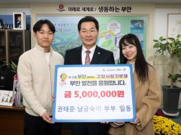 부안군은 25일 결혼한 지 한 달도 채 되지 않은 새내기 부부가 어려운 살림에도 불구하고 고향사랑기부금 500만원을 기탁해 지역사회에 큰 감동을 주고 있다고 밝혔다.화제의 주인공은 권태준(남편)·남궁숙