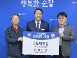 지역 인재육성의 산실인 (재)순창군 옥천장학회에 장학금 행렬이 이어지고 있다.순창군은 14일 (유)만성사업이 옥천장학회에 지역인재 육성에 써달라며 장학금 500만원을 기탁했다고 밝혔다.만성산업은 순창