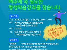 여수시는 시민 삶에 필요한 맞춤형 평생교육 프로그램을 발굴하기 위해 ‘2026년 평생학습 특성화 강좌 지원사업’을 공모한다고 밝혔다.이번 사업은 ‘2026년 명품 평생학습도시’ 조성을 목표로 지역 특성