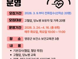 영광군보건소는 만성질환 예방과 군민 건강수명 연장을 위해'2026년 상반기 고혈압·당뇨병 건강교실'참여자 20명을 선착순 모집한다고 밝혔다. 고혈압과 당뇨병은 자각증상이 적어 관리가 소홀해지기 쉬운