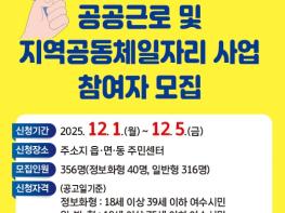여수시는 오는 12월 1일부터 5일까지 2026년 상반기 공공일자리 사업 참여자 356명을 모집한다. 모집 분야는 ▲정보화형 공공근로 40명 ▲일반형 공공근로 및 지역공동체일자리 316명이다.신청 자격은 공고