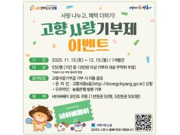 장흥군은 11월 15일부터 12월 15일까지 한 달간, ‘사랑 나누고, 혜택 더하기 고향사랑기부제 이벤트’를 추진한다고 밝혔다.연말정산을 앞두고 열리는 이번 이벤트는 기부 활성화와 고향사랑기부제 참여 분