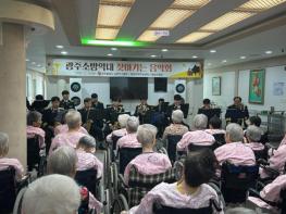 광주광역시 소방안전본부는 10일 북구 생용동 패밀리전문요양원·한울요양원에서 ‘광주소방악대 찾아가는 음악회’를 열고, 어르신들에게 따뜻한 위로와 감동을 전했다.이날 공연에서 광주소방악대원들은 50