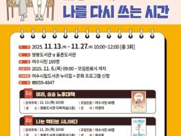 여수시는 생애전환기를 맞이하는 중장년층을 위해 ‘2025년 신중년 독서 아카데미’를 오는 11월 13일부터 27일까지 매주 목요일 오전 10시에 운영한다.이번 아카데미는 ‘인생 2막, 나를 다시 쓰는 시간’