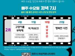 원주시여성커뮤니티센터는 성평등한 문화 향유 기회를 확대하고, 시민 간 공감과 소통을 도모하기 위해 매년 수요보라영화관을 운영하고 있다. 올해는 2월부터 12월까지 매주 수요일 오후 7시 여성커뮤니티