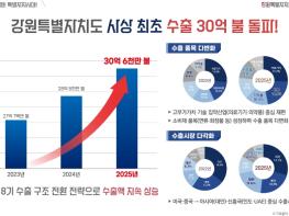 강원특별자치도는 민선 8기 출범 이후 미국의 관세 부과와 신보호무역주의 확산, 국제 분쟁 장기화 등 어려운 통상 여건 속에서도 사상 처음으로 연간 수출 30억 불(한화 4조 5천억 원)을 달성했다고 밝혔다