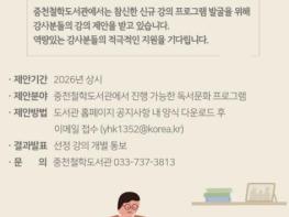 원주시 중천철학도서관은 시민의 다양한 요구에 부응하기 위해 2026년 독서 문화 프로그램 제안을 상시로 접수한다.제안 분야는 중천철학도서관에서 진행할 수 있는 인문학 관련 독서 문화 프로그램이다.강