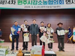 제14차 원주시강소농협의회 정기총회 및 이취임식이 지난 4일 원주시농업기술센터 생명농업관에서 개최됐다.이날 원주시강소농협의회 제5대 회장으로 이학원 신임 회장이 취임했다. 또한 조경일 전임 회장을