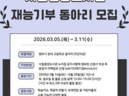 원주시립중앙도서관은 올해 상반기 청소년 재능기부 동아리 봉사활동에 참여할 관내 고등학교 동아리 학생들을 모집한다.이번 봉사활동은 도서관을 방문하는 어린이들을 대상으로 청소년들이 가진 다양한 재