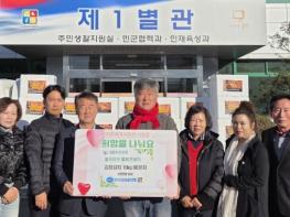 한국자유총연맹 철원군지회가 지난 7일 양구군 2025 양구 펀치볼 김장나눔축제 행사장에 모여 직접 담근 사랑의 김장김치 10kg, 80상자(370만원 상당)를 10일 철원군청 주민생활지원실 앞에서 나눔 전달식을