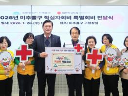인천 미추홀구는 28일 구청장실에서 대한적십자사 인천지사(회장 조의영)와 적십자봉사회 미추홀구협의회(회장 조혜정) 등이 참석한 가운데 적십자 특별회비 200만 원을 전달했다.이날 전달된 특별회비를 포