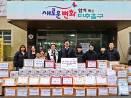 인천 미추홀구는 16일 구청장실에서 지역 내 후원처로부터 저소득층 지원을 위한 후원 물품을 전달받았다. 이번 전달식에는 런앤점프, 미추홀복싱클럽, 아리푸드 등 지역 사회 후원처가 참여해 라면 100상자
