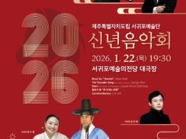 서귀포시는 1월 22일 19시 30분 서귀포예술의전당 대극장에서 ‘제주특별자치도립 서귀포예술단 2026 신년음악회’를 개최한다.이번 공연은 기운차게 한 해를 시작하는 관객들의 시작을 응원하는 의미로 202