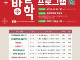 인천 동구 미래교육지원센터는 1월 10일~2월 28일까지 관내 초·중학생을 대상으로 겨울방학 교육 프로그램을 운영한다고 밝혔다.이번 프로그램은 방학 기간 발생할 수 있는 학습 공백을 예방하고 학생들의