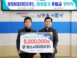 인천시 남동구는 보스시큐리티 주식회사(대표이사 공병석)로부터 사회복지시설 및 단체 지원을 위한 후원금 5백만 원을 기탁받았다고 31일 전했다. 기부금은 복지 사각지대 해소와 취약계층 지원을 위한 다