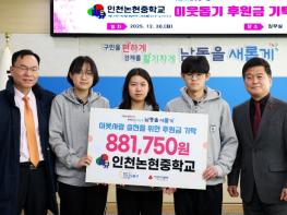 인천시 남동구는 인천논현중학교로부터 축제 기간 진행한 모금을 통해 조성된 기부금 881,750원을 기탁받았다고 31일 밝혔다. 이번 모금은 인천논현중학교 축제에서 학생과 학부모가 자발적으로 참여해 마