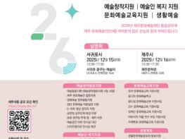 제주문화예술재단(이사장 김석윤)은 2026년도 지원사업 1차 통합공모를 실시한다. 접수 기간은 2025년 12월 15일부터 2026년 1월 5일까지이며, 문화예술교육 지원사업은 2026년 1월 9일까지 접수한다. 이번
