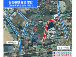 제주시는 남문로터리 인근 남성로25길의 보행환경 개선을 위해 일부 구간을 일방통행로로 지정하고, 확보되는 도로 잔여 공간에 보행로와 노상주차장을 조성한다. 해당 구간은 남문로터리·중앙로와 제주남