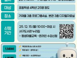 인천광역시교육청서구도서관에서는 어린이들의 인공지능(AI) 이해를 높이고 창의적 문제해결 능력을 기르기 위한 제112회 겨울 독서교실 ‘책으로 만나는 AI’를 운영한다.이번 프로그램은 초등학교 4학년