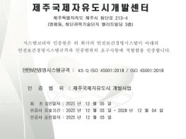 제주국제자유도시개발센터는 전사적인 안전보건 관리체계를 구축한 성과로 국제표준 안전보건경영시스템(ISO45001) 신규 인증을 취득했다고 밝혔다. ISO 45001은 조직의 안전보건 리스크를 체계적으로 관리