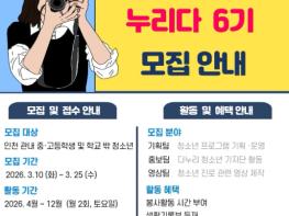 인천광역시교육청중앙도서관 청소년 문화공간 ‘다누리’는 10일부터 청소년 자치 기구‘누리다’의 6기 단원을 모집한다.‘누리다’는 다누리 운영 의사결정 과정에 참여하는 자치 기구로 선발된 청소년 단
