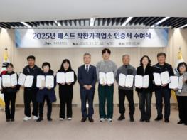 제주특별자치도는 도내 최초로 ‘2025년 베스트 착한가격업소’ 15개소를 선정하고 21일 인증서 수여식을 개최했다.착한가격업소는 재료비와 인건비 상승에도 합리적인 가격을 유지하는 개인 서비스업소를