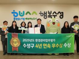 대구 수성구는 지난 24일 대구시가 주관하는 ‘2025년도 환경관리업무 평가’에서 4년 연속 우수상을 수상했다.이번 평가는 대구시 9개 구·군을 대상으로 2025년 한 해 동안 추진한 환경정책, 기후대기, 수