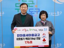 한마음새마을금고(이사장 전숙자)는 1월 27일 오후 3시 30분 울산광역시 동구청을 찾아 ‘사랑의 좀도리 운동’으로 모은 700만원 상당의 백미(10kg) 176포대를 전달하며 지역 사회에 온기를 불어넣었다. 이